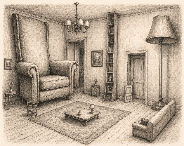 NOTE: This is a level design contribution post looking for feedback from YT channel @Jesus_Machina, who explains design concepts and sets weekly challenges. This time, the challenge is to design a common space where some items are up or downscaled so they feel off.